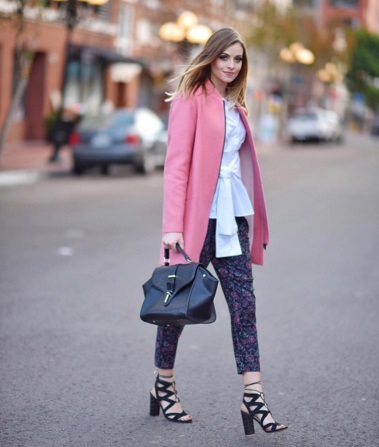 1) Pair a pastel pink coat with basic neutrals: For minimalist fashionistas who want an effortless look that will take their work neutrals to a chic off-duty style, rock a blush pink coat dress with a loose pastel grey turtle neck sweater and a light grey denim for a not-so basic ensemble. The muted grey tones paired with the subtle pop of pink bring a soft and feminine flare to a simple, monochromatic outfit. Accessorize with a grey satchel bag and a white pointed-toe caged stilettos to complete the look.