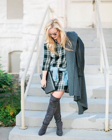 4) Wear a black and white flannel shirt dress with a grey wool coat: Dress down your go-to grey wool coat with a flannel shirt dress for a casual weekend attire perfect for a sunny spring day. Go for a classic black and white long-sleeved shirt and for a fun sporty touch, tie a chambray shirt around your waist to break off the bold print. Accessorize with a black clutch and adorn your feet with suede knee-high boots.