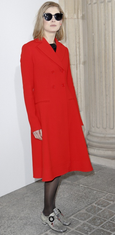 At the Christian Dior show, Rosamund Pike was as pretty as a picture in a bright red double-breasted coat from the Paris-based fashion house. The coat displayed the 37-year-old actress’ enviable figure, while her oversized black sunglasses, black stockings and funky textured loafers contrasted against the crimson shade.