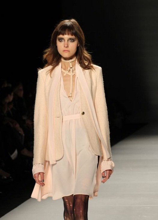 At Toronto-based lifestyle brand Helder Diego, co-designers Helder Aguiar and Diego Fuchs focused on simplicity with an edgy finish for the season ahead. Models stormed the catwalk in rebellious torn stockings, black lace-up ankle boots and preppy blazers. Meanwhile, shades of pale pink made an appearance in the form of culottes, blouses and sleeveless sheath dresses.
