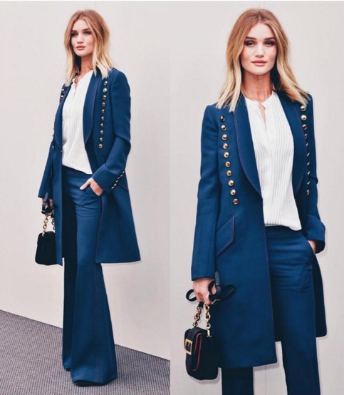 To bring instant elegance into your Saturday sartorial statement, get your fashion inspiration from Rosie Huntington-Whiteley. The 28-year-old Victoria’s Secret Angel pairs her flared navy blue trousers with an airy white blouse for a girlish yet classic look. Meanwhile, her matching tailored coat features bold military inspired buttons for a contrasting effect. Grab a similar navy blue mini handbag with chain detail, and prepare to stun as you enjoy brunch with your girlfriends.