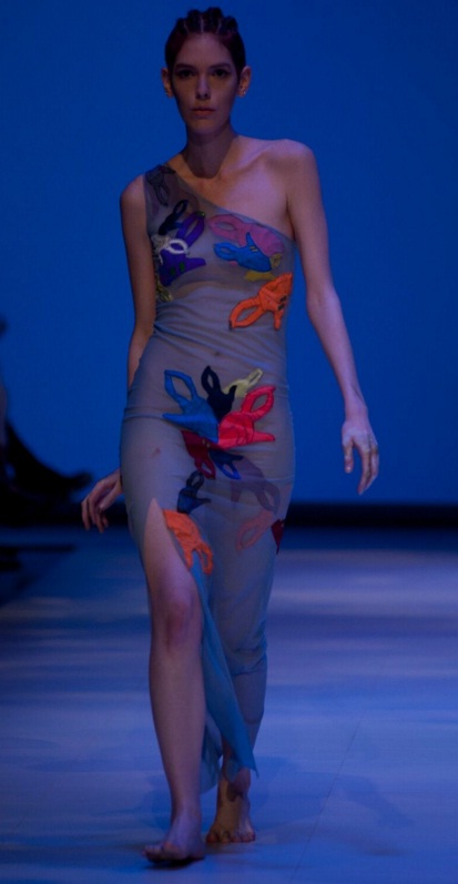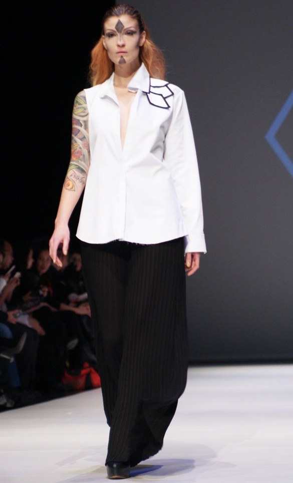 Toronto designer Tanya Theberge studied fashion at George Brown College, and recently launched her emerging label La Femme Theberge. The line, which describes its design aesthetic as dark, mysterious and rebellious, showcased a new collection of structured and androgynous designs. In particular, the diamond shape was a key motif that reigned supreme on everything from white blouses to embellished cut-outs.