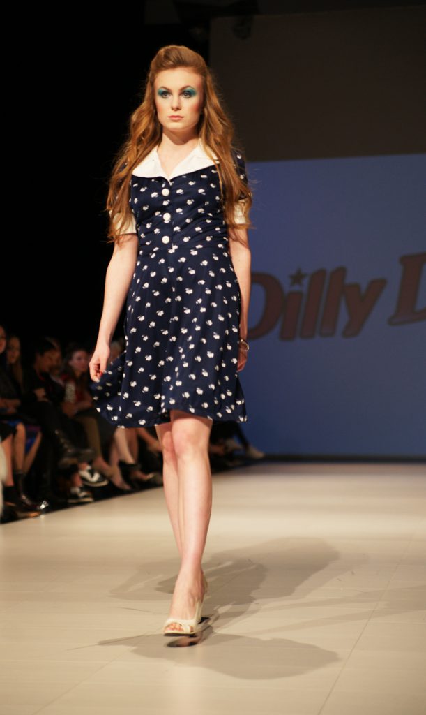 Born and raised in Windsor, Ontario, designer Dee-Dee Shkreli is a former electrical engineer who turned her focus to fashion design in 2005. For her new line Speak Out, Shkreli took her inspiration from the groovy and free-spirited 1970s. The designer interpreted the political and social movement of freedom of speech, bringing the decade of disco to the FAT catwalks in the form of sassy, printed creations. From shades of green and brilliant red to classic blue and white, polka dots and sweet floral patterns ushered in ‘70s spirit.