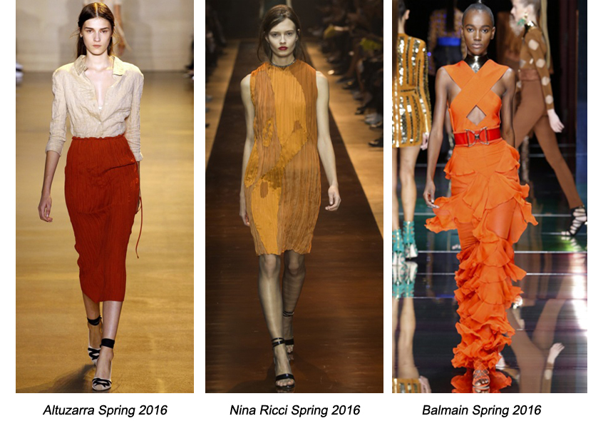 As the sun sets and the night’s festivities begin, swap your muted and work-appropriate orange shades for a vibrant tangerine hues and Spanish flair (as seen at Balmain). Slip into a flowing dress adorned with a series of ruffles, a waist-cinching belt and a sultry criss-cross neckline. The look of tiers and ruffles, coupled with the sunset inspired hue, will leave you ready to cause a sensation on the dance floor.
