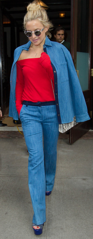The 36-year-old actress proves that laidback denim can easily be transitioned into a statement look when paired with hints of bright colour. Hudson looks gorgeous in a slightly faded blue denim jacket with a shirt inspired design, which she combines with matching flared denim trousers. Meanwhile, her brilliant red off-the-shoulder blouse, textured handbag and quirky round sunglasses help to complete her retro chic look.