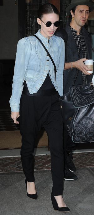 If you’ve previously thought that light wash denim is a look best left in the past, then Rooney Mara’s approach to the trend just may change your mind. The striking 30-year-old Pan actress looks stylish in a fitted light jean blazer with a mandarin collar and intricate tiny buttons. Mara’s black harem pants, black platform wedges and dainty black shades bring a touch of sophistication to her neutral look.