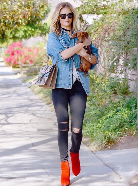 With her statuesque proportions, British beauty Rosie Huntington-Whiteley perfectly embodies model off-duty style in an oversized faded denim jacket styled with ripped skinny black denim. The 28-year-old Victoria’s Angel wraps up her ensemble with a loose grey tee, a pair of orange ankle boots and a playful pastel handbag for a whimsical effect.
