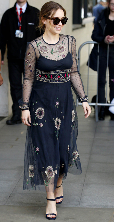 The 29-year-old British bombshell may star as Daenerys Targaryen on Game of Thrones, but Emilia Clarke also looks gorgeous away from the small screen. We are loving her semi-sheer navy blue dress, which features a flowing midi hemline, transparent long sleeves and contrasting floral embroidery. Meanwhile, the strappy dark blue sandals and oversized dark brown shades help to complete her chic and elegant look.