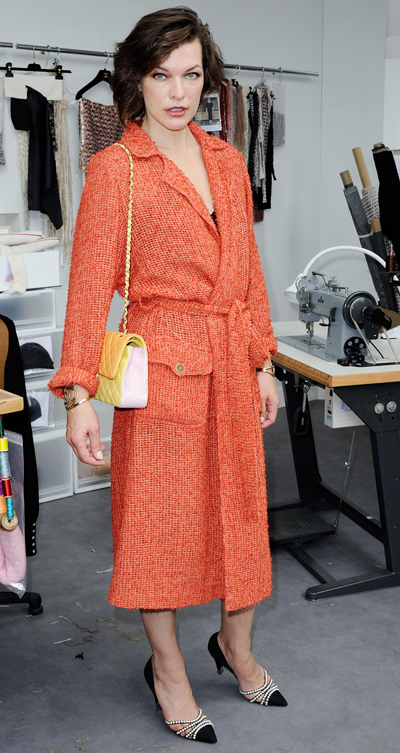 Meanwhile, Jovovich looked absolutely radiant in an orange-red knitted coat dress, as she posed backstage at the show. The 40-year-old Ukrainian-born actress and model styled her look with a pair of dainty black pearl-studded Chanel pumps. For a finishing touch, she sported a pale pink and orange chain handbag and intricate metallic bangles.