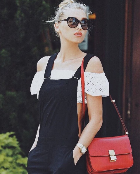 For a comfortable and wearable take on the season’s cropped peasant blouse, try taking your sartorial cues from Elsa Hosk. The 27-year-old Swedish model looks gorgeous in a white crochet crop top, layered under a pair of dark navy blue overalls. Hosk brings a pop of colour to an otherwise neutral outfit with a punchy red handbag, while her oversized dark shades and gold watch polish off her style.