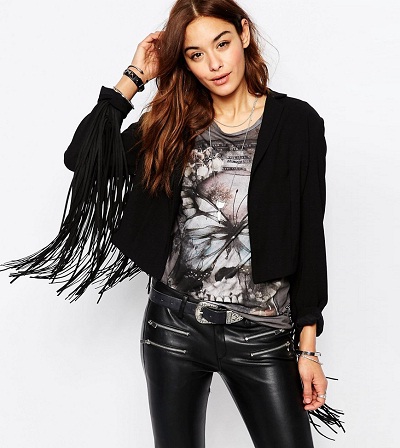 2) Religion Festival Fringing Jacket, $254: While the July temperatures may be rising, Jenner proves that a cropped suede jacket can be paired with a crop top for a summer appropriate take on the trend. This faux suede topper makes a splash with its open front, dangling fringe and flirty cut.