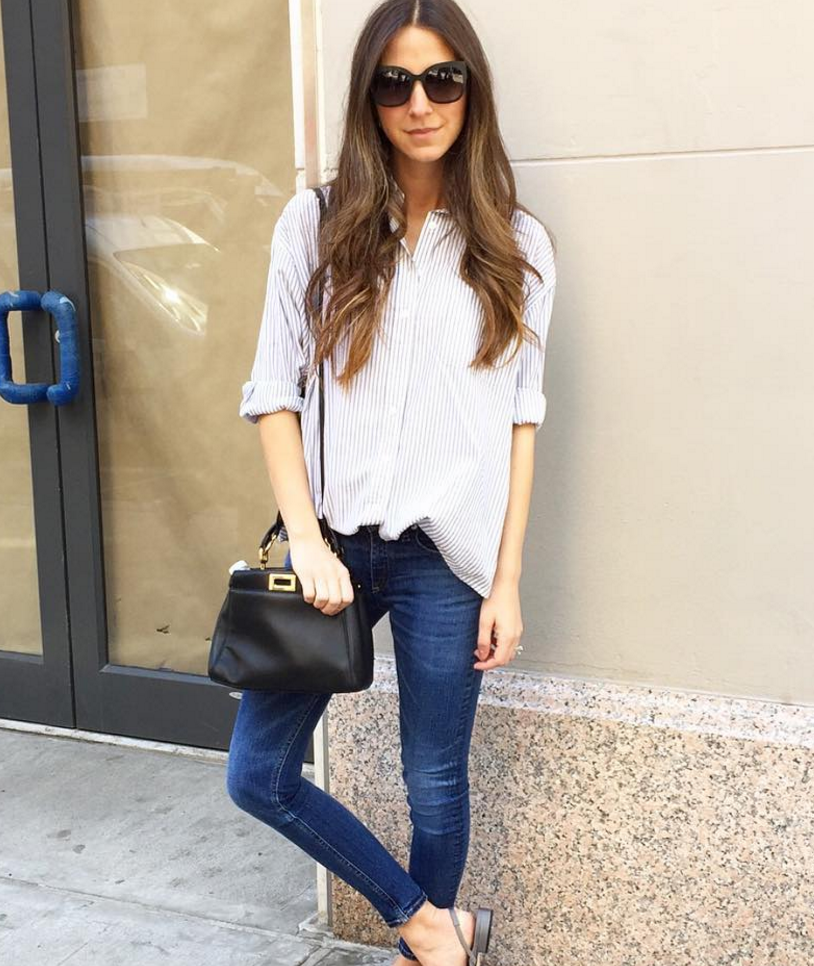 Crisp button down blouse: Teaming a loose fit, crisp button down shirt over a pair of tailored trousers or washed denim, accessorised with bangle bracelets is a perfect summer workplace outfit, especially a casual Friday. Throw on a pair of cute and comfortable flats for a completed look.