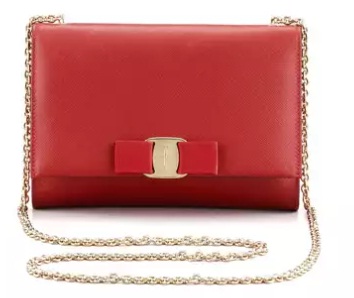 3) Salvatore Ferragamo Miss Vara Bow Wallet-on-a-Chain in Red, $989: For a contrasting effect, try carrying a brilliant red clutch as a finishing touch. The candy apple hue of this chain handbag, along with the dainty golden chain, can easily brighten an otherwise neutral ensemble.