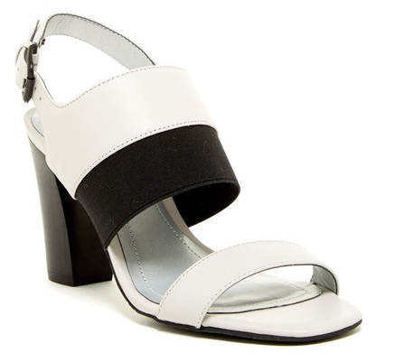 3) Tahari Peace Heel Sandal, $40: Try accessorizing the sleek faux leather and ladylike pleated fabric with these chunky black and white sandals. The block heels offer a bit of a boost, while the wide straps offer a funky effect.