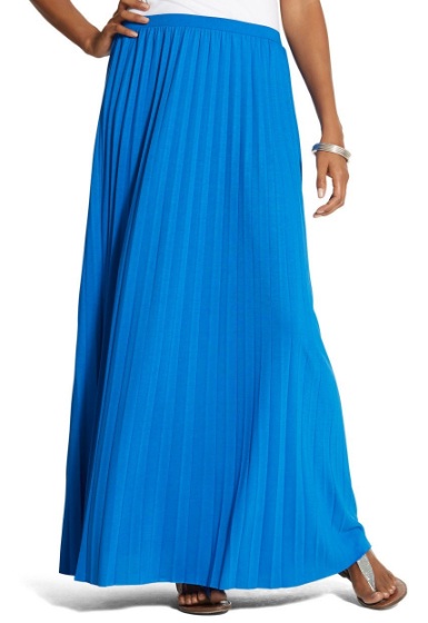 1) Chico’s Pleated Maxi Skirt, $89: The breathtaking blue colour of this long skirt is sure to bring a pop of colour to your weekend wardrobe. Meanwhile, the delicate accordion pleats help to complete the design.