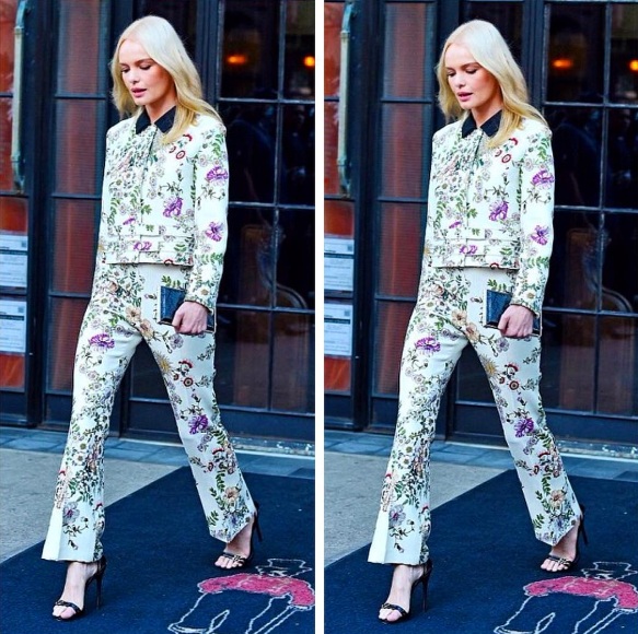 The 33-year-old actress looks beautiful in this artfully decorated Giambattista Valli pantsuit, which features a feminine floral print. If you’re worried about looking too staid at the bar, splashy patterns help to bring a work-friendly outfit from morning to night. The cropped and flared trousers and Peter Pan collar on the jacket add a girlish finish, while the black strappy sandals are incredibly classic.