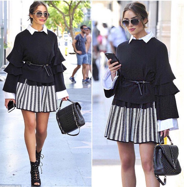 Naturally, a pair of edgy caged heels or lace-up booties helps to balance out a preppy and polished outfit for the corporate day. Take your cues from 24-year-old model Olivia Culpo, who stuns in a navy blue tiered blouse layered over a crisp white shirt. We are also liking the printed pleated skirt, leather chain strap handbag and fierce heels, for a mix of workday glam and weekend grunge.