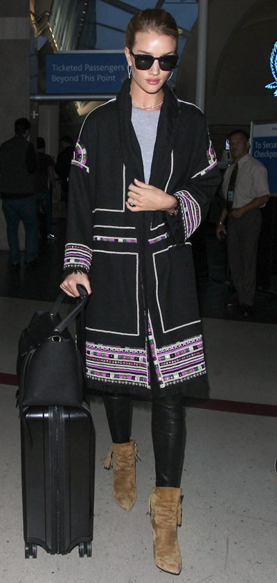 Staying true to her reputation as a style icon, the 29-year-old British model makes a splash in this LAX Airport ensemble. Huntington-Whiteley is stunning in a lightweight black embroidered coat by Isabel Marant, which features fringed detail. For a finishing touch, her black leather leggings and tan suede boots add to the bohemian aesthetic of her outfit.