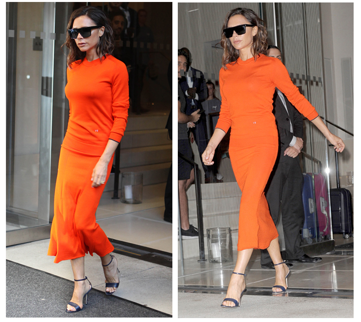 The 42-year-old fashion designer and former Spice Girl is always flawlessly dressed, and this season is certainly no exception. Beckham looks gorgeous in this bright red orange frock from her eponymous label’s Spring 2017 collection. The long sleeves and flared three-quarter length hem flatter her slender physique, while the punchy hue warms up her skin tone.