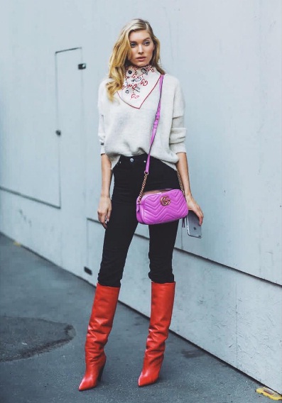 The 27-year-old Swedish model looks adorable in this grey cowl neck sweater, which is accented with red embroidery. If you’re looking to channel the season’s whimsical touches, colourful floral embroidered detail helps to complete your style. Hosk’s black skinny jeans and red knee-high boots perfectly flatter the tones in her sweater, while her contrasting purple mini handbag offers a pop of colour.
