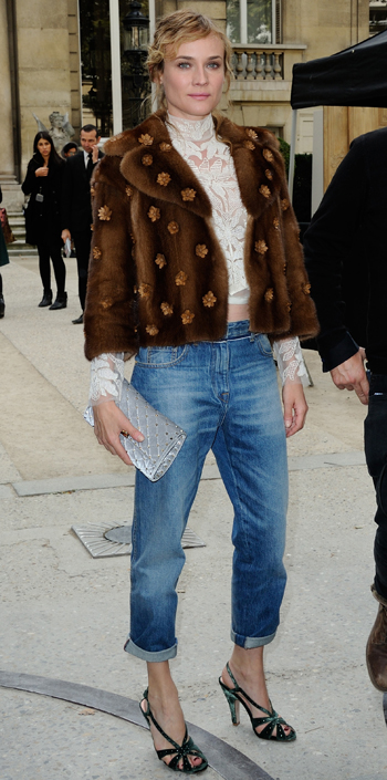 The 40-year-old German actress absolutely stuns in her brown fur jacket, effortlessly layered over a delicate cream-coloured lace blouse. Meanwhile, her rolled-up boyfriend jeans, strappy dark green stilettos and metallic silver clutch all create an outfit which merges casual chic with evening style.