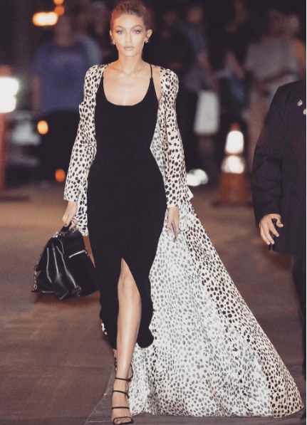 While Gigi Hadid can often be spotted in barely there ensembles, the 21-year-old model is just as chic in this strappy black midi dress layered with a longline leopard print coat. For a contrasting effect, combine your own black dress with an edgy animal print topper.