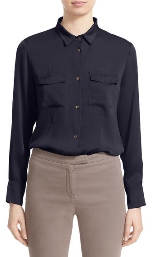 1) Eleventy Stretch Silk Blouse, $274: To channel your inner corporate gal, try slipping into this navy blue silk blouse with its modest long sleeves. The sharp collar and chest pockets wrap up the design.