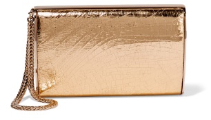 3) Jimmy Choo Carmen Metallic Cracked-Leather Box Clutch, $633: For a shimmering accessorizing finish against the luxurious dress, try embracing a similar metallic clutch. This cracked leather piece features a tiny gold chain, rectangular shape and shiny surface.
