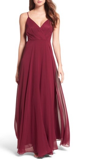 1) Lulus Surplice Chiffon Gown, $136: We are loving the deep burgundy colour of this airy chiffon number, which features a floor-length pleated skirt. Meanwhile, the sweetheart bodice and barely-there straps wrap up the design.