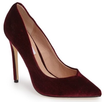 2) Steve Madden Wicket Pump in Burgundy Velvet, $126: These pumps make a statement with their pointed almond toes and towering stiletto heels. The rich colour and velvety texture also help to complete the entire style.