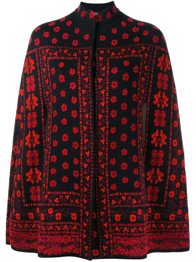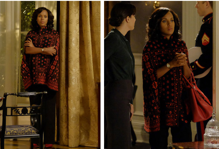 1) Alexander McQueen Floral Jacquard Knit Cape, $1,727: This statement wool-silk topper steals the spotlight with its scarlet and black jacquard design and ladylike high collar. While it’s certainly a splurge, Olivia is a radiant sight in this eye-catching coat, which flatters her rich cocoa skin tone with its bright red motif.