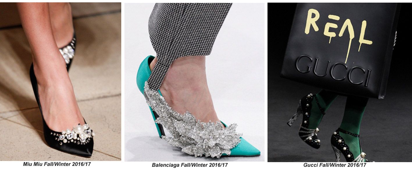 For a day at the office, lower heels and dainty, conservative embellishment are key elements. Look no further than the Miu Miu catwalk, where intricate pearls immediately rejuvenated the look of timeless black pumps with almond-shaped toes.