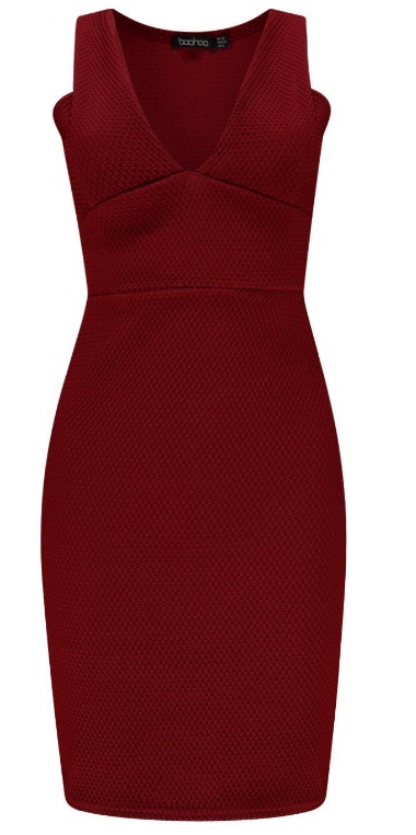 1) Callie Textured Plunge Neck Bodycon Dress, $21: This budget-friendly frock just may help you get Harmony’s classic style without breaking the bank. Along with its short hem, textured detail and rich berry red colour, the dress also features a waist-cinching effect for an hourglass shape.