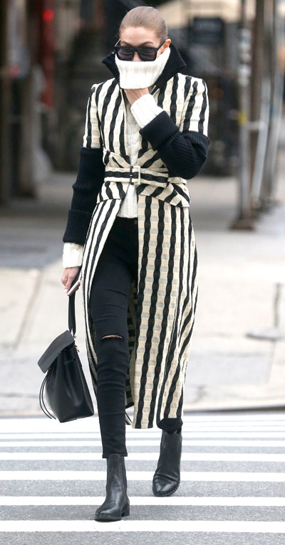 As always, Gigi Hadid has been stunning this entire season with her chic, eclectic take on winter dressing. Take your cues from the 21-year-old model with a similar black and white striped coat, which brings a cool, quirky finish to her ensemble. Hadid layers up against the New York City chill in a chunky white turtleneck sweater and black jeans, for a model off duty take on timeless black and white.