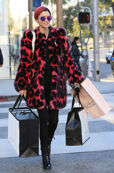The 30-year-old Australian beauty looks gorgeous in this oversized Marc Jacobs faux fur coat, which makes a splash with its magenta and black colour scheme. Meanwhile, the eye-catching leopard print brings a wild side to Rose’s ensemble, and truly brightens the sidewalk. For a contrasting touch, the Orange Is the New Black star combines her colourful topper with black skinny denim and black ankle boots.