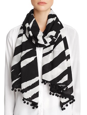 5) Tory Burch Animal Striped Scarf, $275: If you prefer bold patterns to vivid solids, look no further than this Tory Burch scarf. The classic black and white colour scheme, along with the tiny pom-poms and funky animal print pattern, all help to create a chic design.