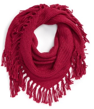 1) Hinge Knit Scarf, $33: The look of a vibrant accent can instantly revive your dark outerwear, especially as we head into the season of dreary, frigid weather. This brightly coloured knit scarf makes a statement with its punchy burgundy tone and chic fringe trim.