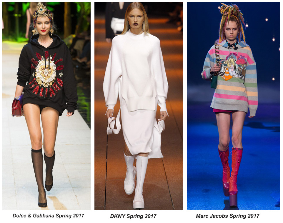 If you’re not dressing to impress but rather to stay comfortable, look no further than the Marc Jacobs runway. The look of vibrant rainbow stripes, shiny accents and a youthful hood bring an urban chic touch to athletic style. Add funky platform boots if you are stepping out, for a contrast in textures and fabrics against the soft sweatshirt material.