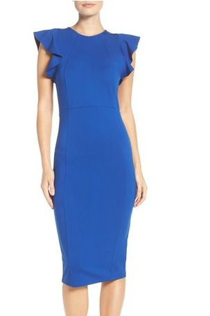 1) Felicity & Coco Ruffle Sheath Dress, $83: We are liking the funky cobalt blue colour of this girlish sheath dress. For a finishing touch, the midi hemline and sweet flutter sleeves offer a structured yet feminine design.