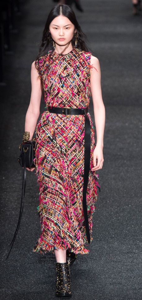Meanwhile, designer Sarah Burton presented a collection for Alexander McQueen which was inspired by the beautiful British scenery of Cornwall. The Fall 2017 lineup involved colourful embroidery, patchwork frocks and brilliant shades of red. For a finishing touch, waists were defined with black leather belts. From sheer illusion necklines to plush red fur accents, pops of colour brightened the otherwise typically rebellious McQueen designs.