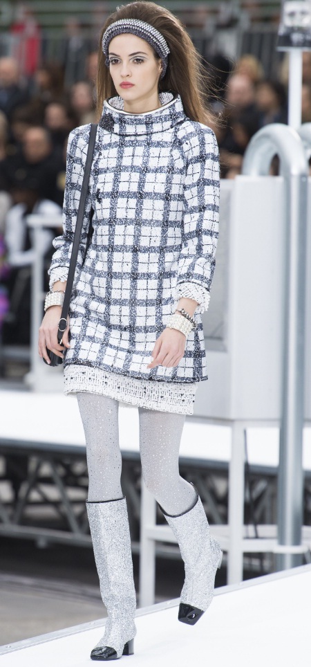 At Chanel, creative director Karl Lagerfeld turned to an outer space theme, with rockets setting the stage for an intergalactic adventure. The models themselves strut the catwalk in sparkly silver grey tights, accessorized with funky silver boots. Meanwhile, black and white tweed jackets, long grey coats and shiny metallic accents brought a combination of classic and futuristic styles together.