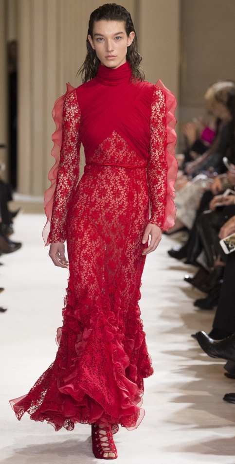 At Giambattista Valli, French femininity ruled the designs. The Italian-born designer unveiled black and white gingham prints, which made an appearance on everything from three-quarter length coats to fitted long-sleeved shirts. White lace dresses were detailed with high collars and tiers, while black crochet frocks and sassy red ruffles brought a contrasting touch to the runways.