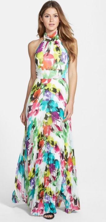 3) Eliza J Print Chiffon Halter Maxi Dress, $221: With high necklines and splashy floral prints dominating the runway, this floor-length Eliza J number is a stylish take on the classic Easter dress. The accordion pleated skirt and rainbow hues contrast against the halter back and waist-cinching sash, which help to create a structured yet airy silhouette.