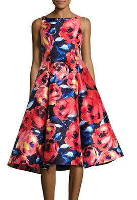 4) Adrianna Papell Printed Mikado Fit-and-Flare Dress, $249: For those fashionistas who like to make a statement, this elaborate patterned piece by Adrianna Papell may flatter your sartorial tastes. The over-the-top blossom print catches the eye with its blue and pink watercolour hues, while the princess-seamed flared hem has a certain fairytale vibe.