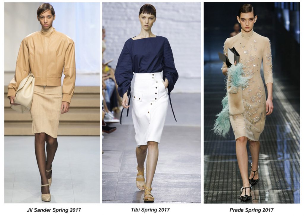 For the weekend, the Jil Sander runway provides all the inspiration for a chic yet wearable take on this moderate skirt length. Slip into a ribbed lightweight turtleneck dress in a nude hue, and pair your frock with a matching camel leather jacket. For a finishing touch, a creamy white leather satchel and a pair of ankle strap heels can offer a polished and feminine effect.