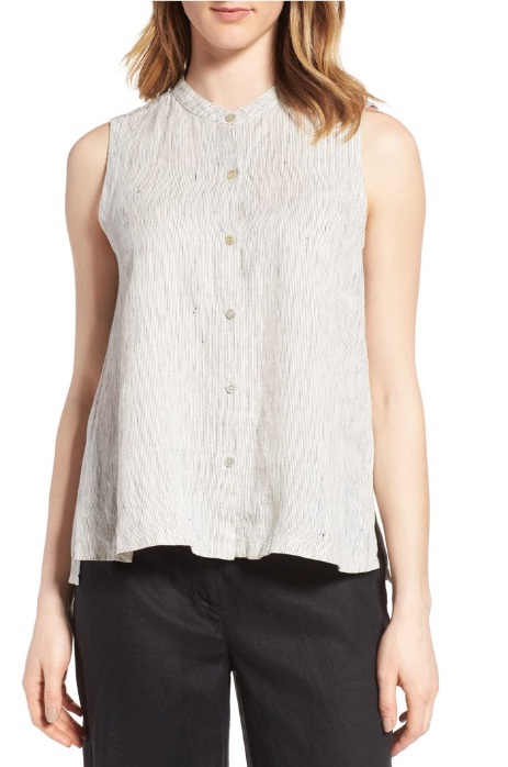 2) Eileen Fisher Stripe Organic Linen Blouse, $191: Try pairing your environmentally friendly denim with a ladylike blouse, such as this sleeveless organic linen top. The neutral off-white hue, barely there pinstripes and tiny buttons all complete the look.