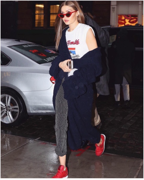 Gigi Hadid: Take your sartorial inspiration from the rising model, who looks gorgeous in this patterned white sleeveless top paired with a long, navy blue knit cardigan. The 21-year-old stunner completes her ensemble with pinstriped black and white cropped trousers and funky red cat eye sunglasses. Meanwhile, her red and white sneakers bring her athletic street style to fashionable new heights.