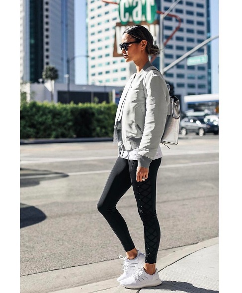 Jamie Chung: You may not think of black leggings as a wardrobe essential, but one only needs to catch a glimpse of Jamie Chung. The 34-year-old actress has paired her lace-up detail leggings with white running shoes and a lightweight grey bomber jacket. For a finishing touch, Chung’s dark shades and silver mini backpack are the perfect spring accessories.