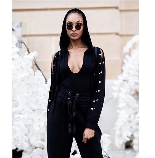 Jourdan Dunn: For a more stylish take on the ubiquitous hoodie, look no further than Jourdan Dunn. The 26-year-old British bombshell is an edgy yet trendy sight in this fitted black hooded top, which features a plunging V-neckline and a series of silver studs on the arms. Her high-waisted black sweatpants offset the skintight silhouette of the top, while her round-framed aviators add a retro inspired look.