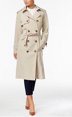 1) London Fog Double-Breasted Trench Coat, $186: This light beige coat features a double-breasted design, a series of buttons and a waist-cinching belt. Meanwhile, the three-quarter length is perfectly ladylike and also appropriate for those dreary rainy days.